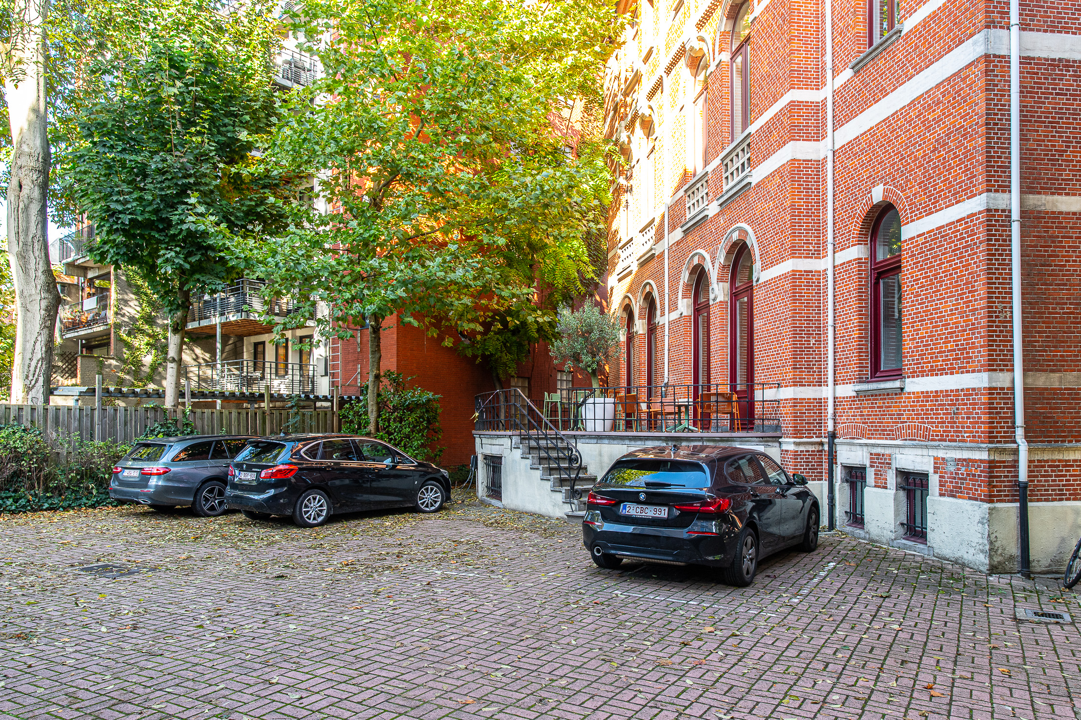 In de tuinzone naast het gebouw is een ommuurde parking, afgesloten met een smeedijzeren poort. In de huurprijs van het kantoor zijn 6 parkings en archiefruimte inbegrepen.
